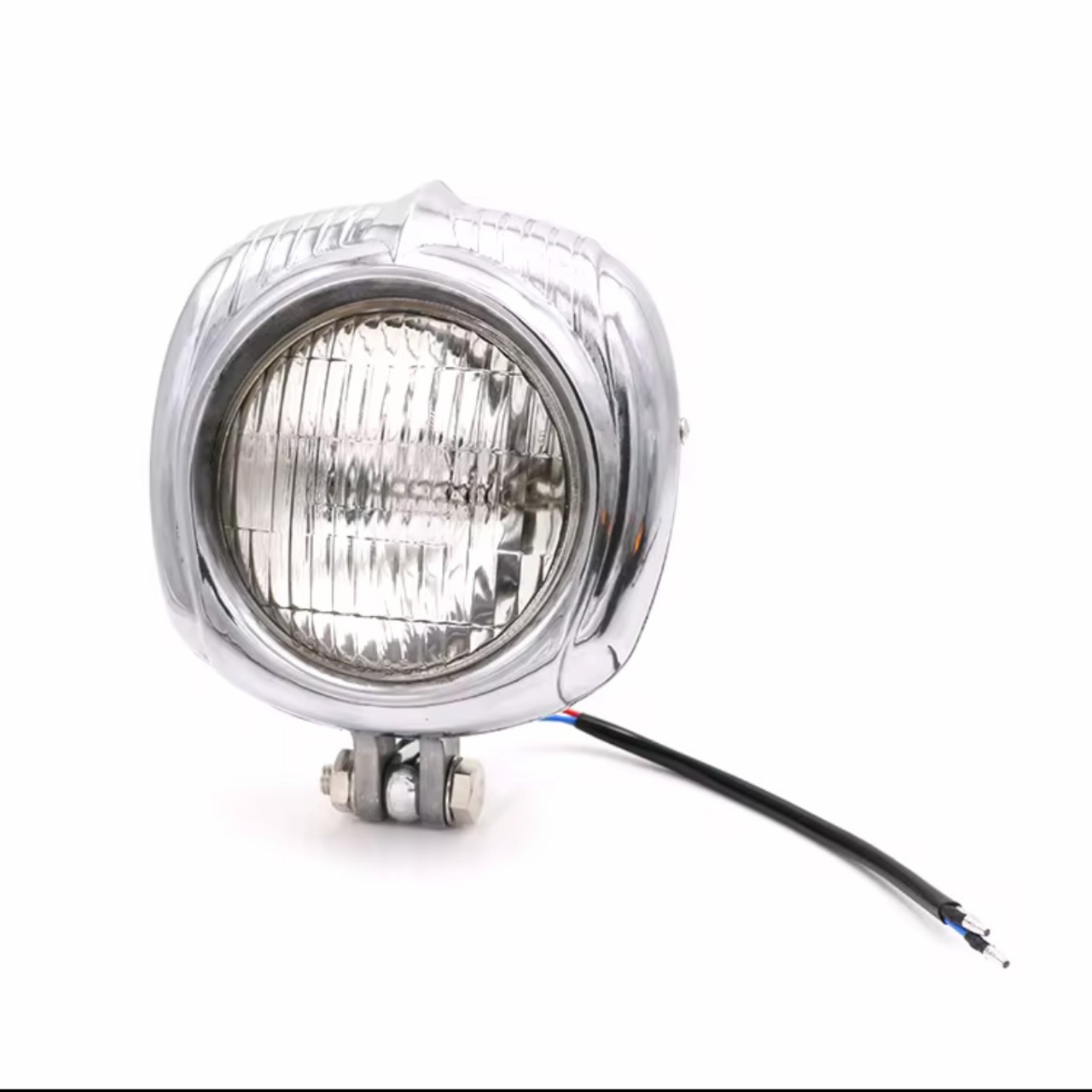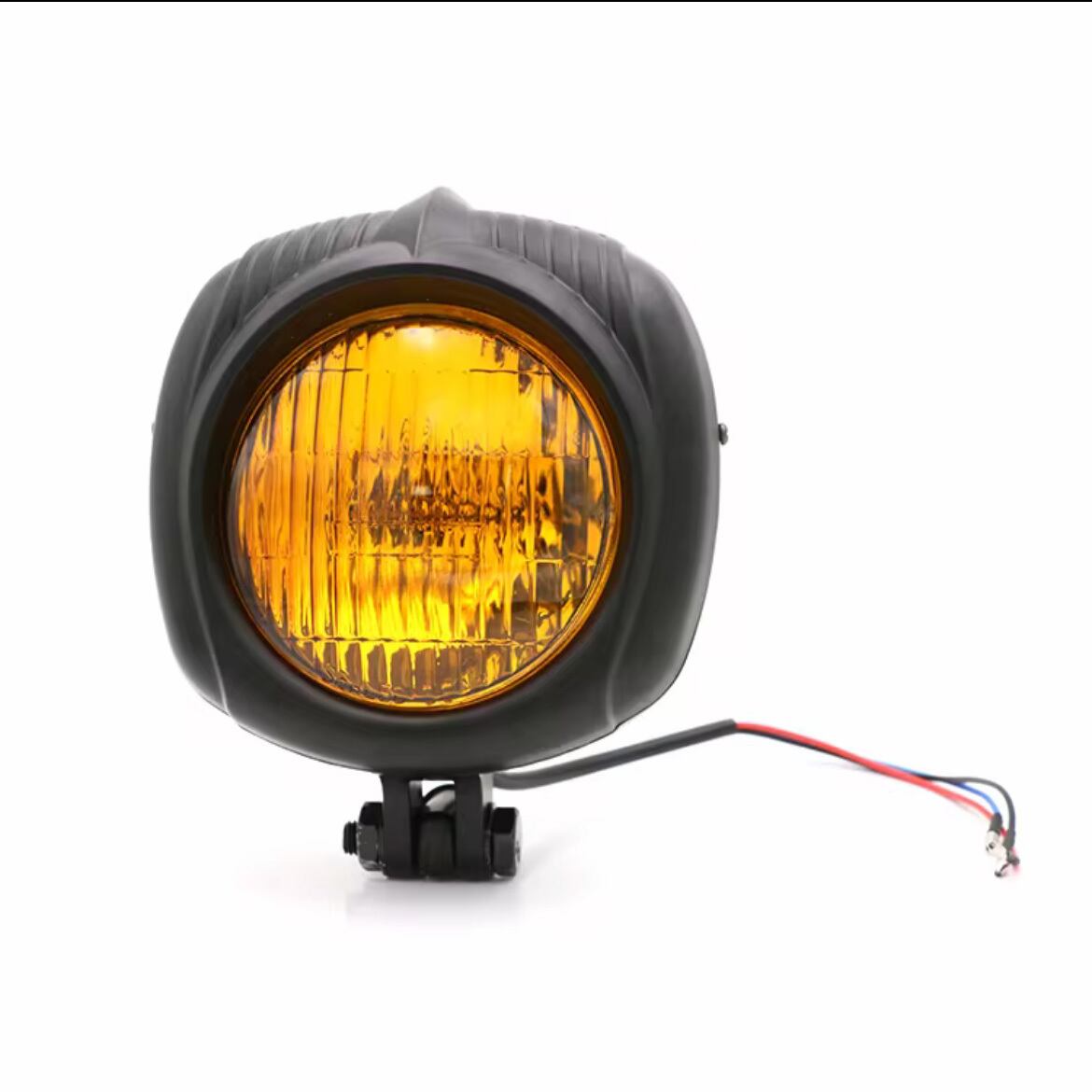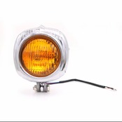 クロームメッキとブラックメッキでそれぞれクリアレンズとイエローレンズがございます。チョッパーなどのカスタムに適した風貌とサイズ感です。ハイ、ローの12Vバルブ式です。