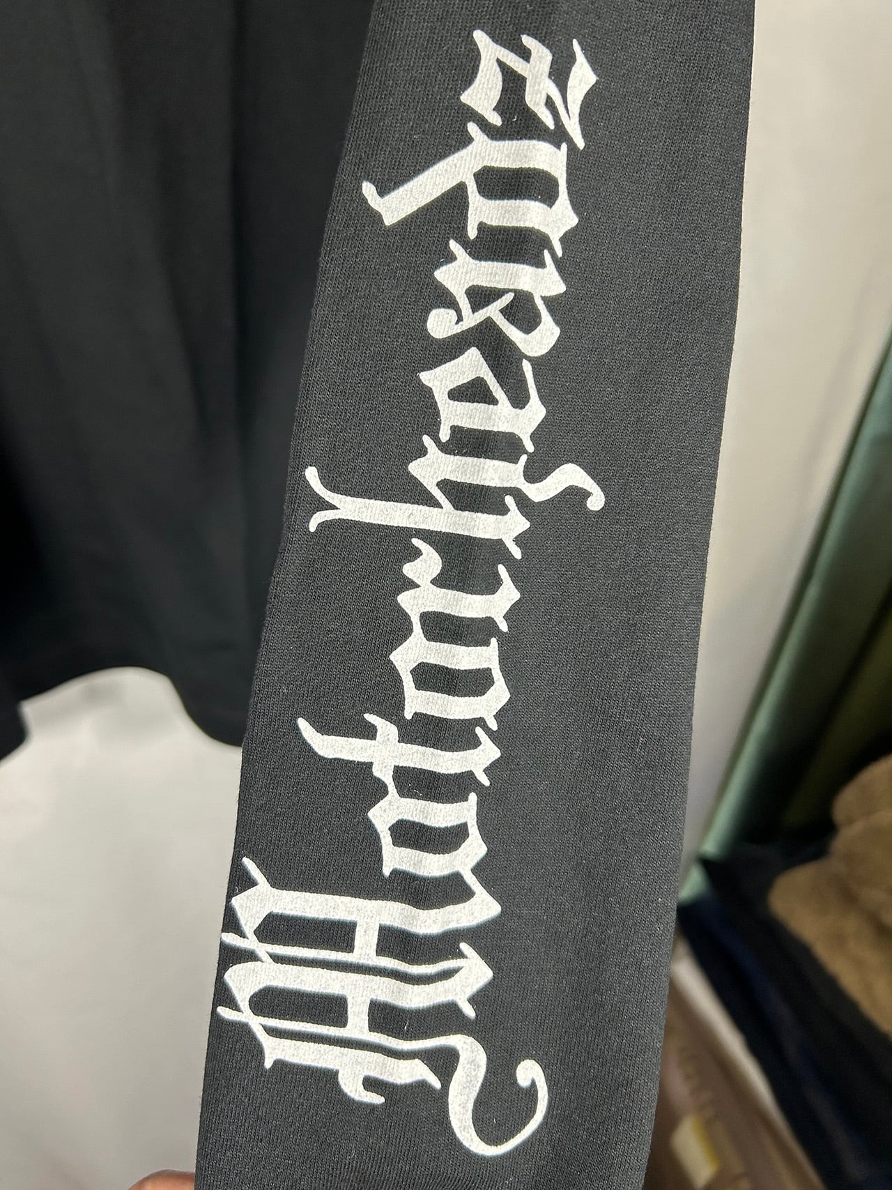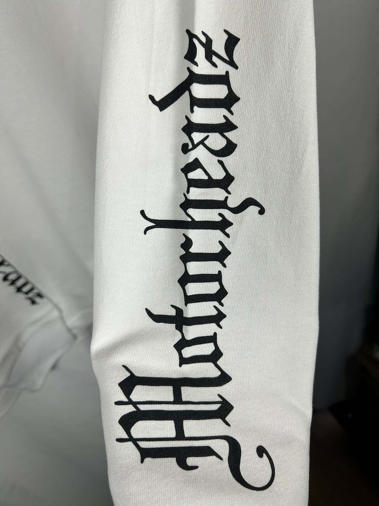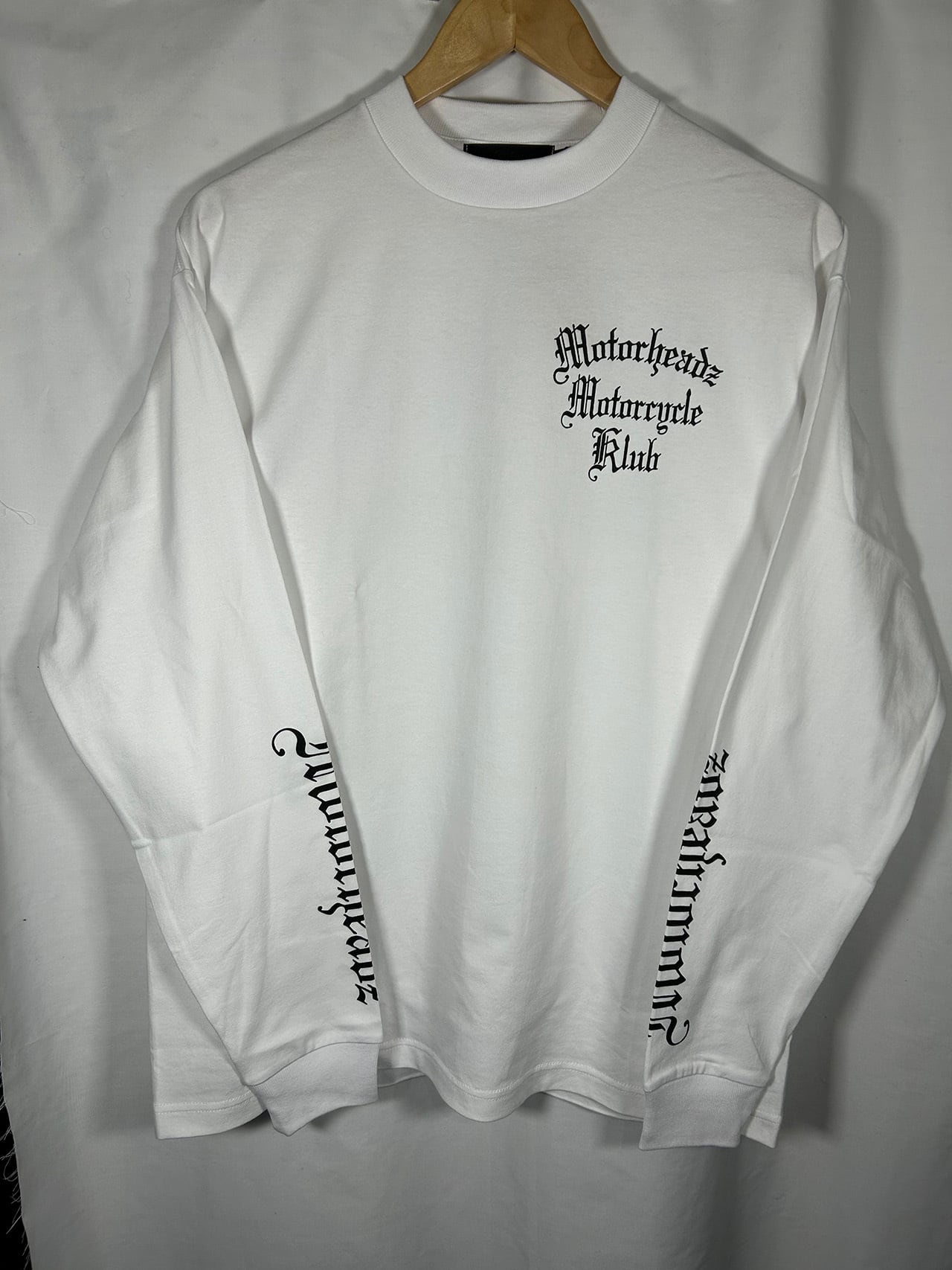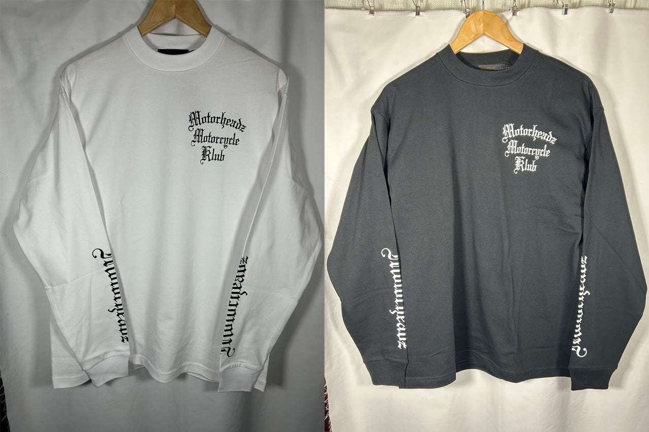 モーターヘッズのオールドイングリッシュロゴのロンTです。袖にもプリント施し重ね着しても存在感があります。7.1オンスのヘビーウエイトボディを使用。ホワイトとブラックの2色展開です。