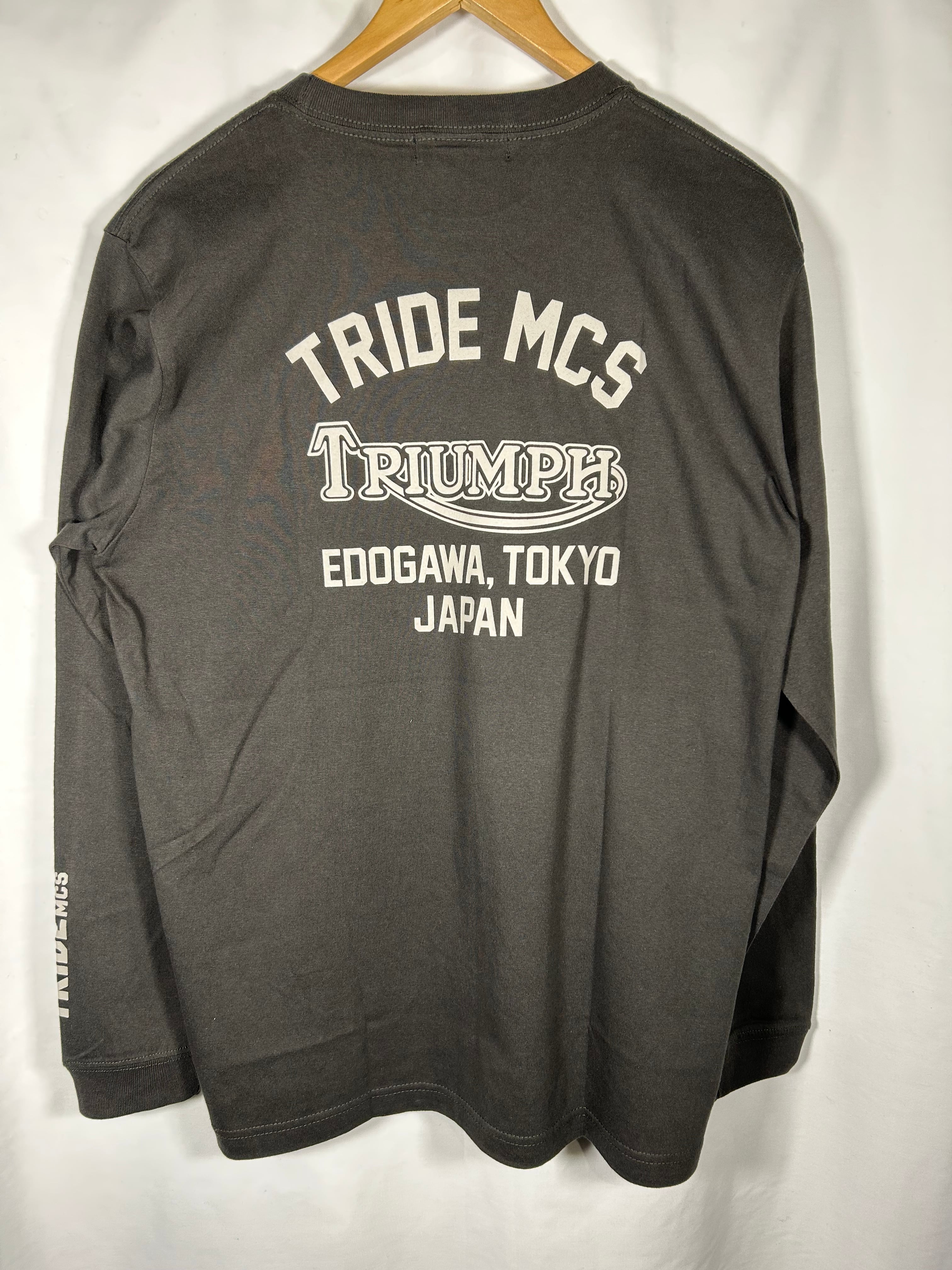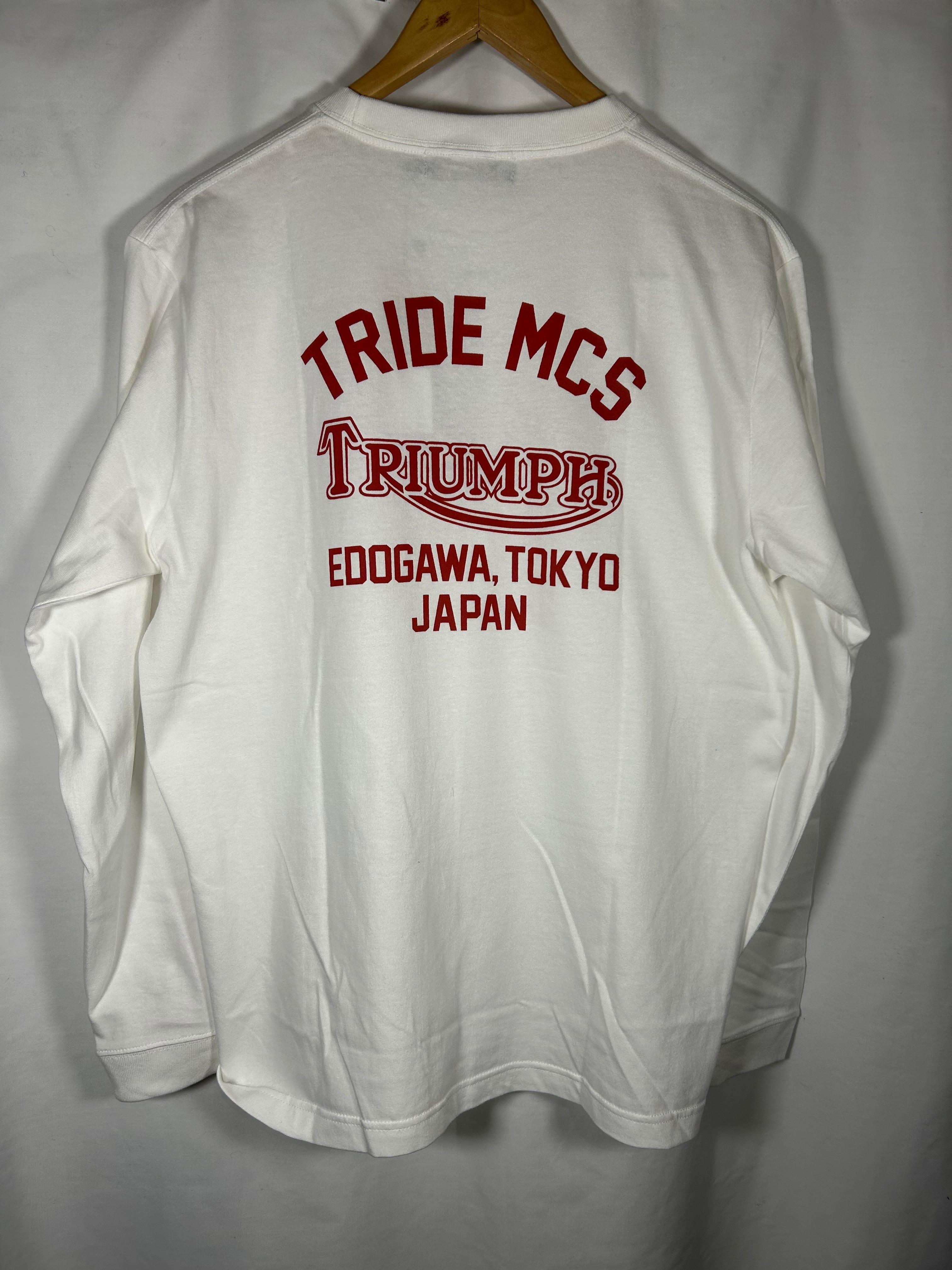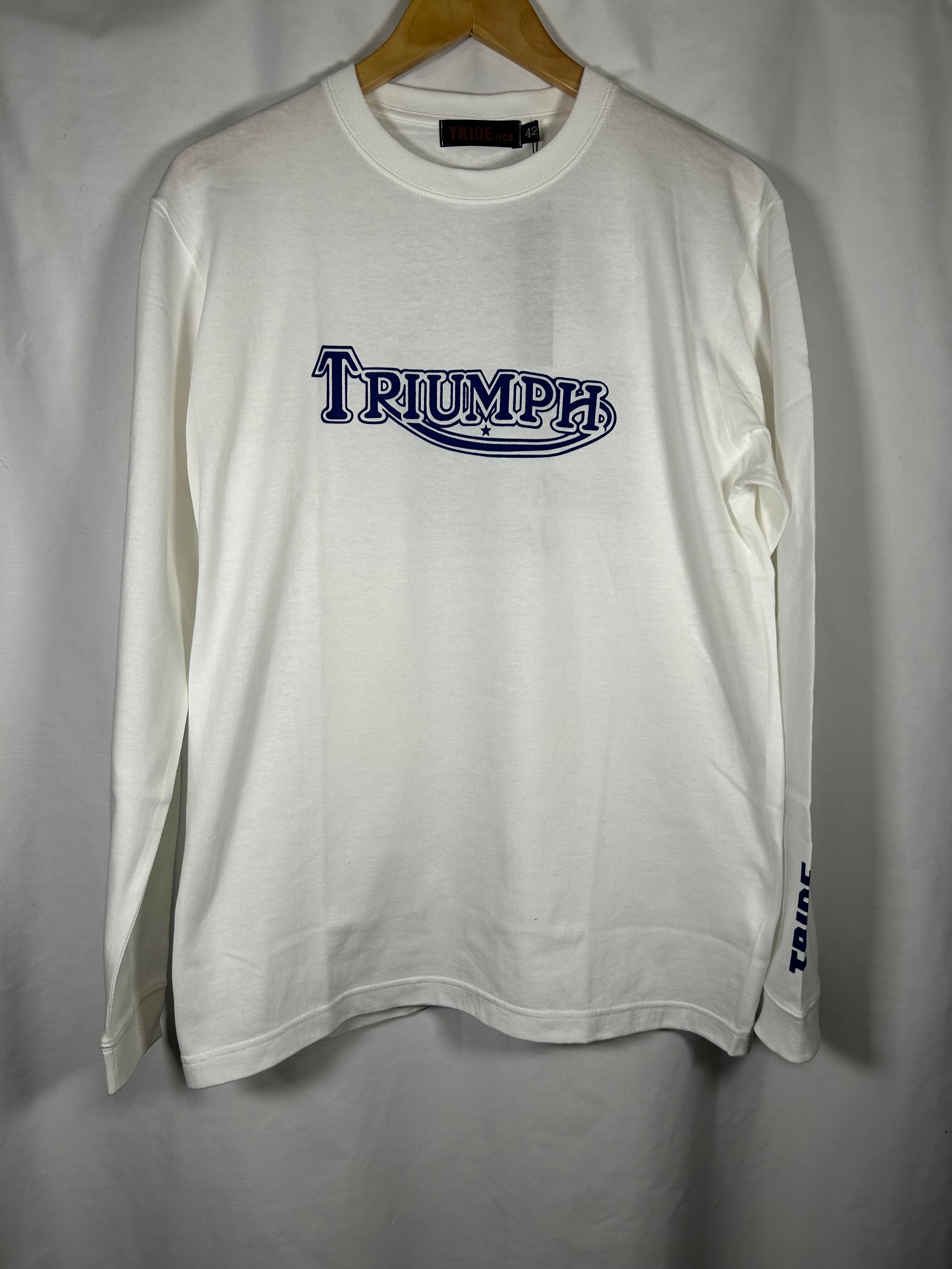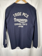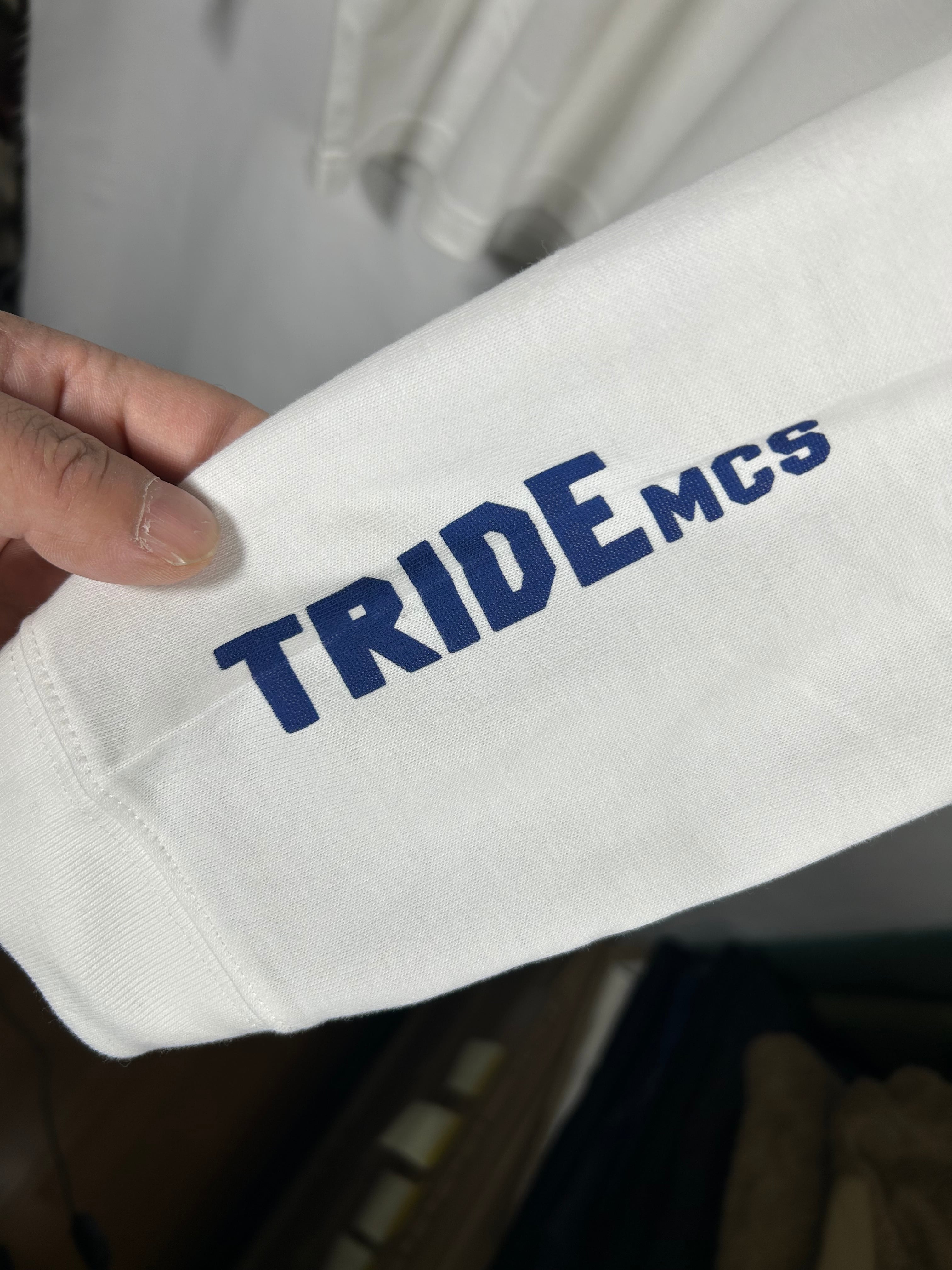 TRIDEトライドのオールドスタイルロゴのロンTです。袖にもさりげなくプリント施し信号待ちでも一際目立つ様にしました。5.6オンスのミディアムウエイトボディを使用しロングシーズに着用可能です。ホワイトxブループリント。ホワイトxレッドプリント、ネイビーとスミ黒の4色展開です。