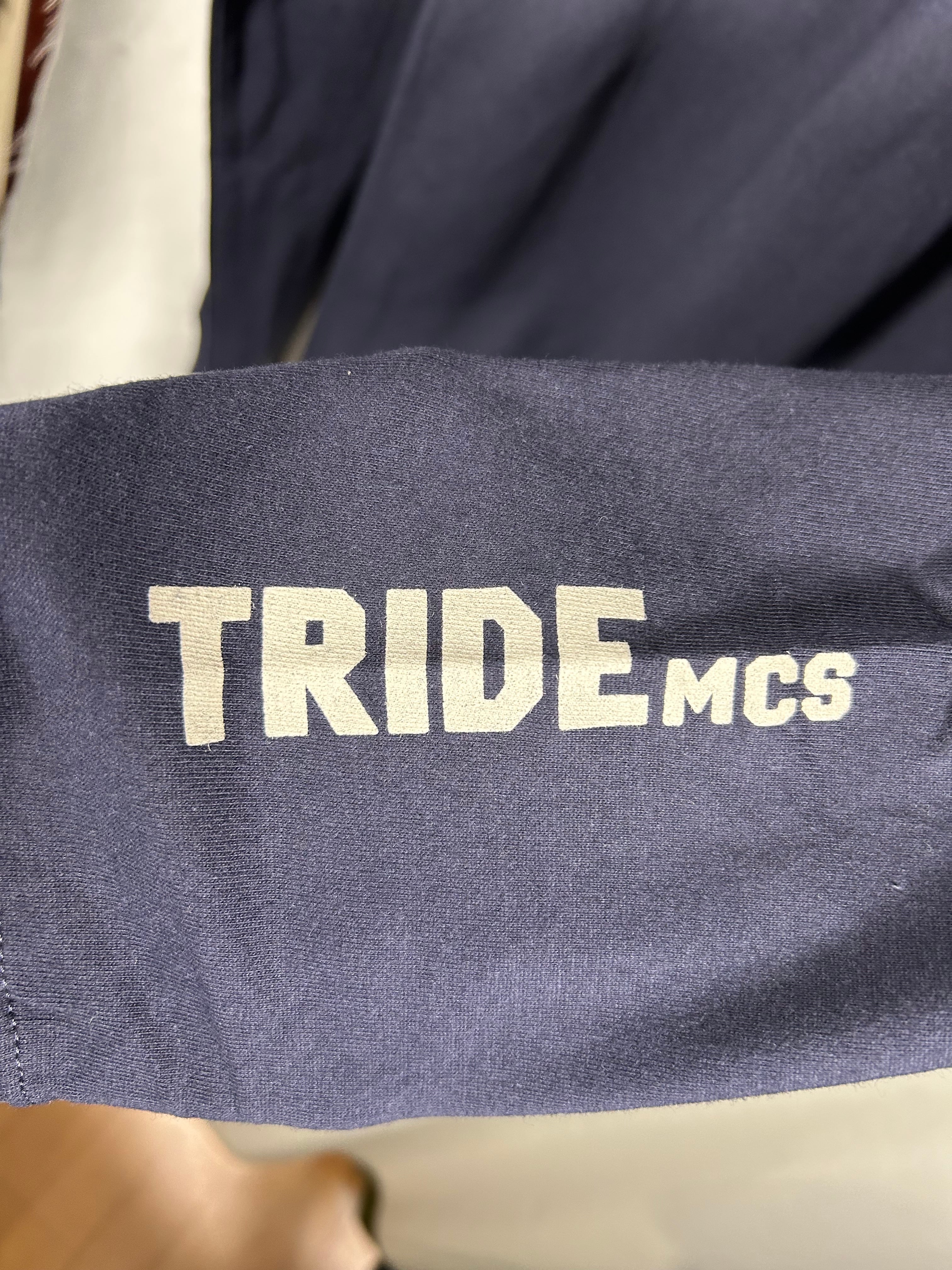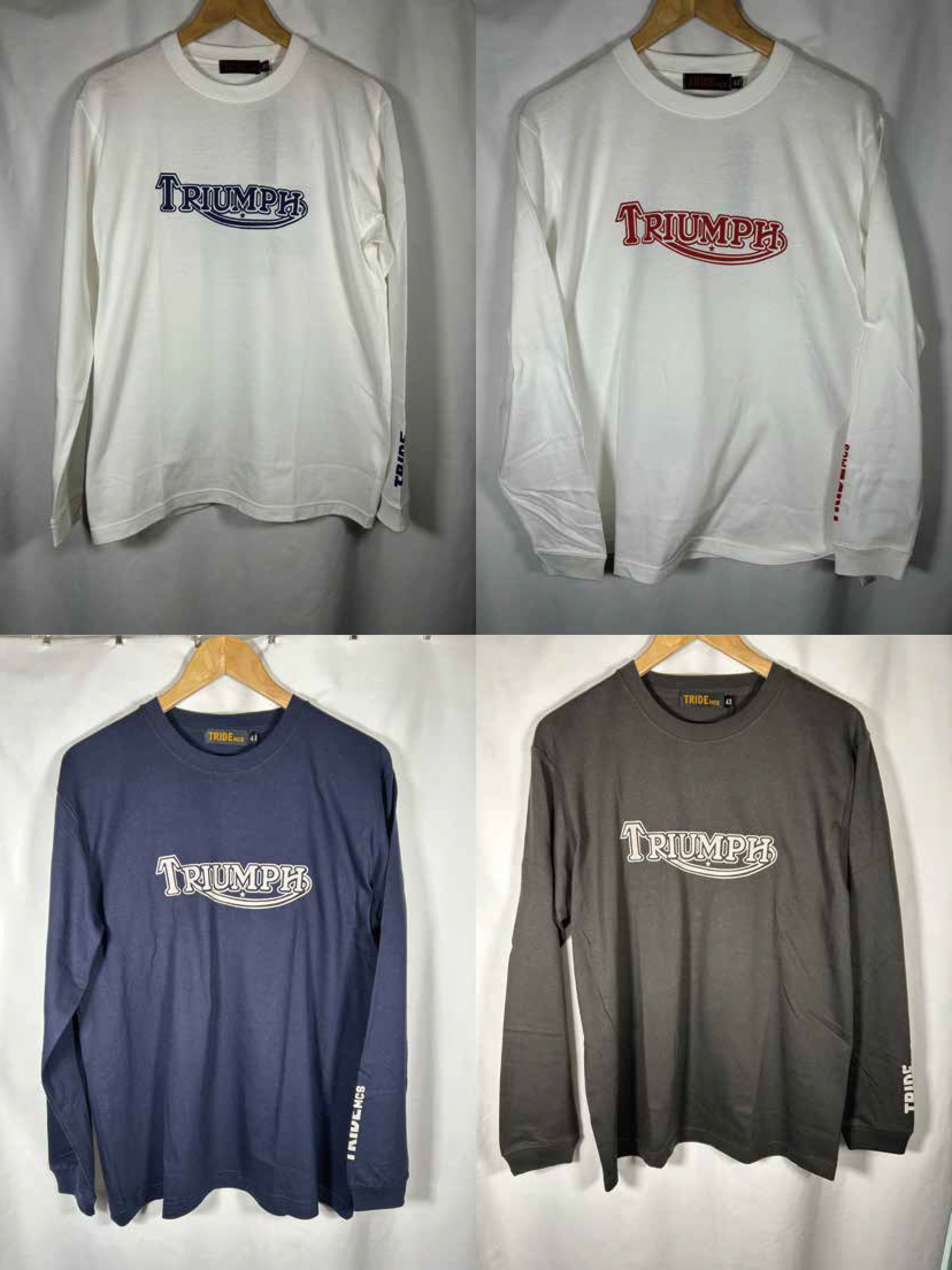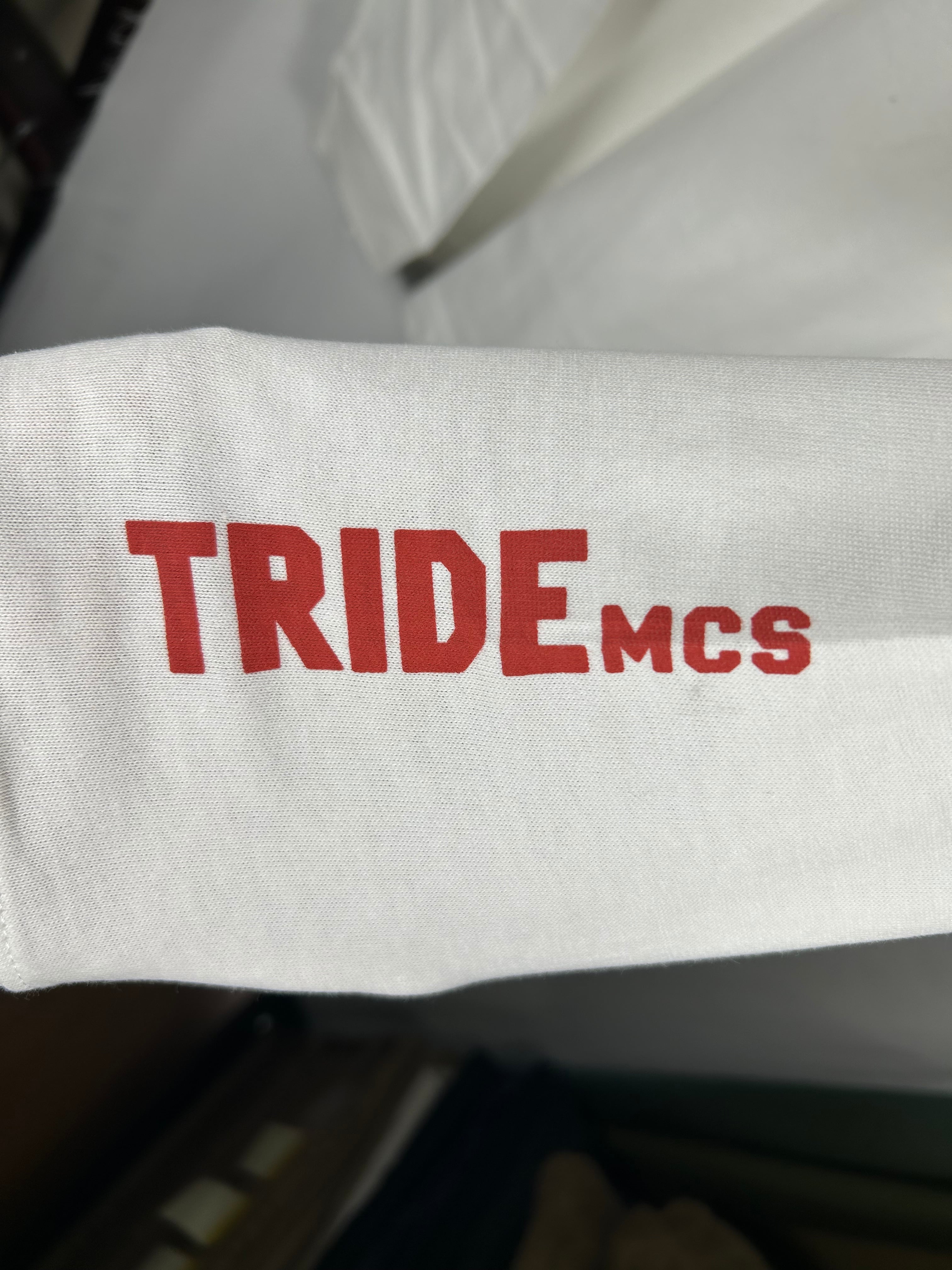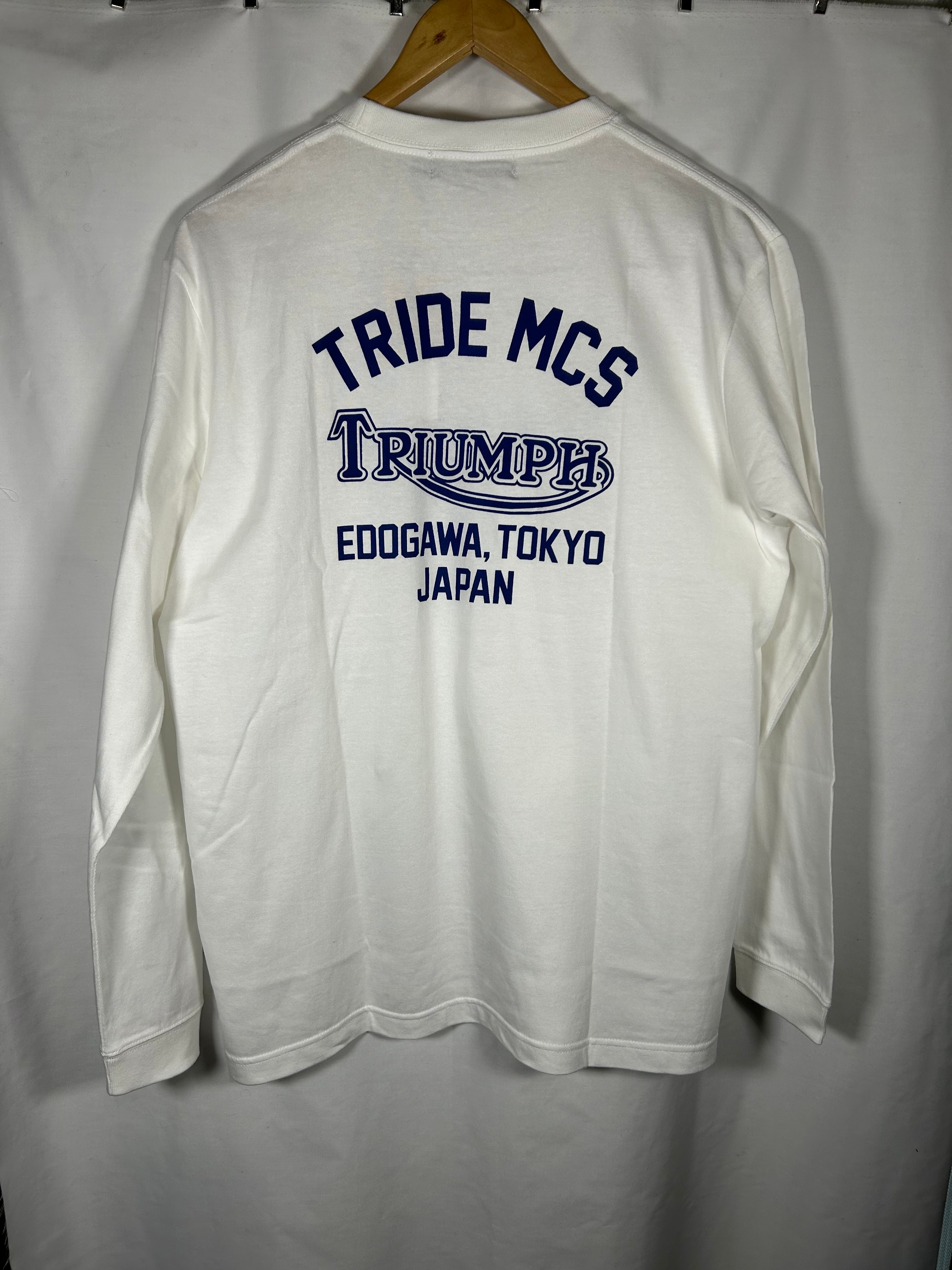 TRIDEトライドのオールドスタイルロゴのロンTです。袖にもさりげなくプリント施し信号待ちでも一際目立つ様にしました。5.6オンスのミディアムウエイトボディを使用しロングシーズに着用可能です。ホワイトxブループリント。ホワイトxレッドプリント、ネイビーとスミ黒の4色展開です。