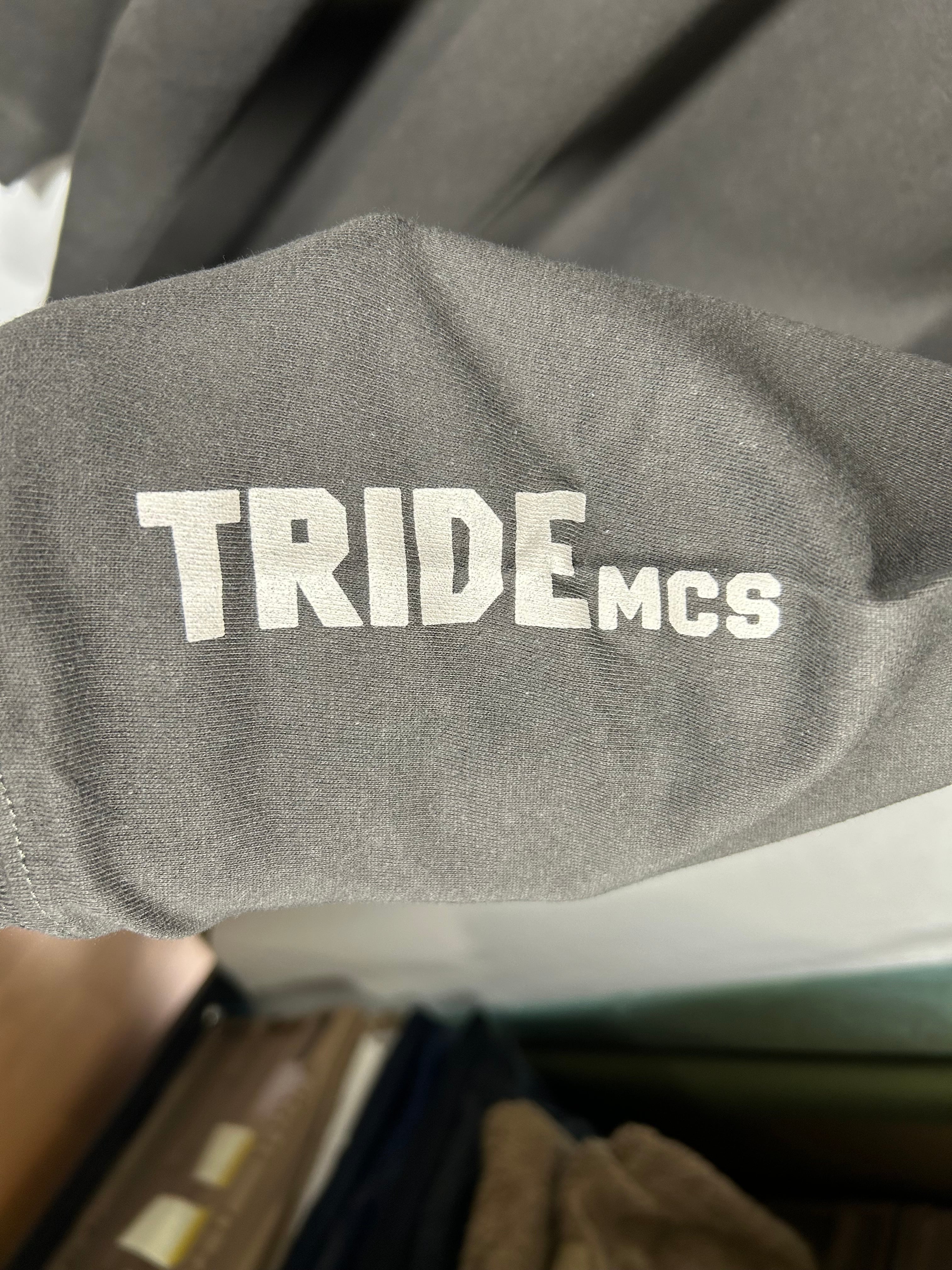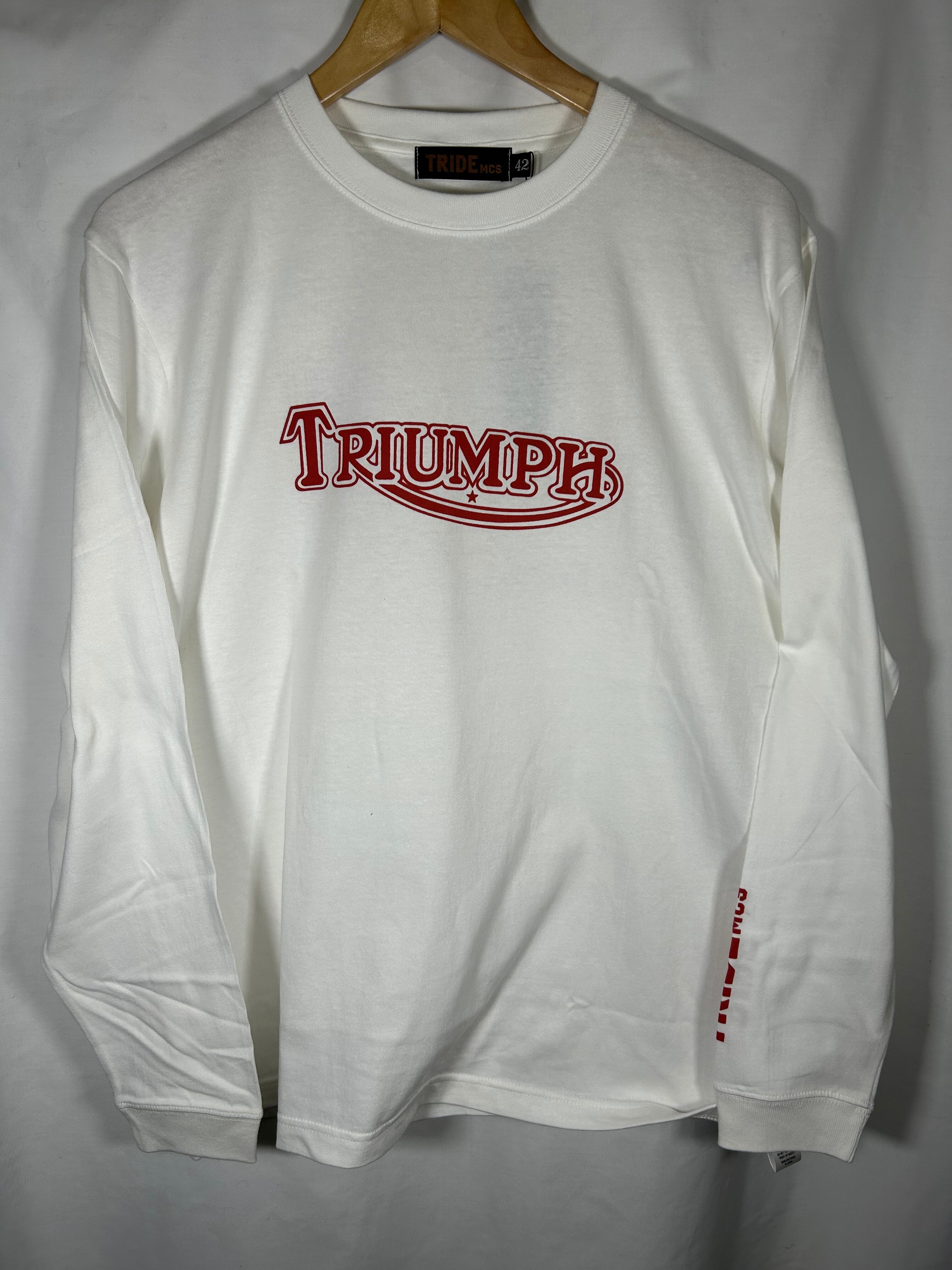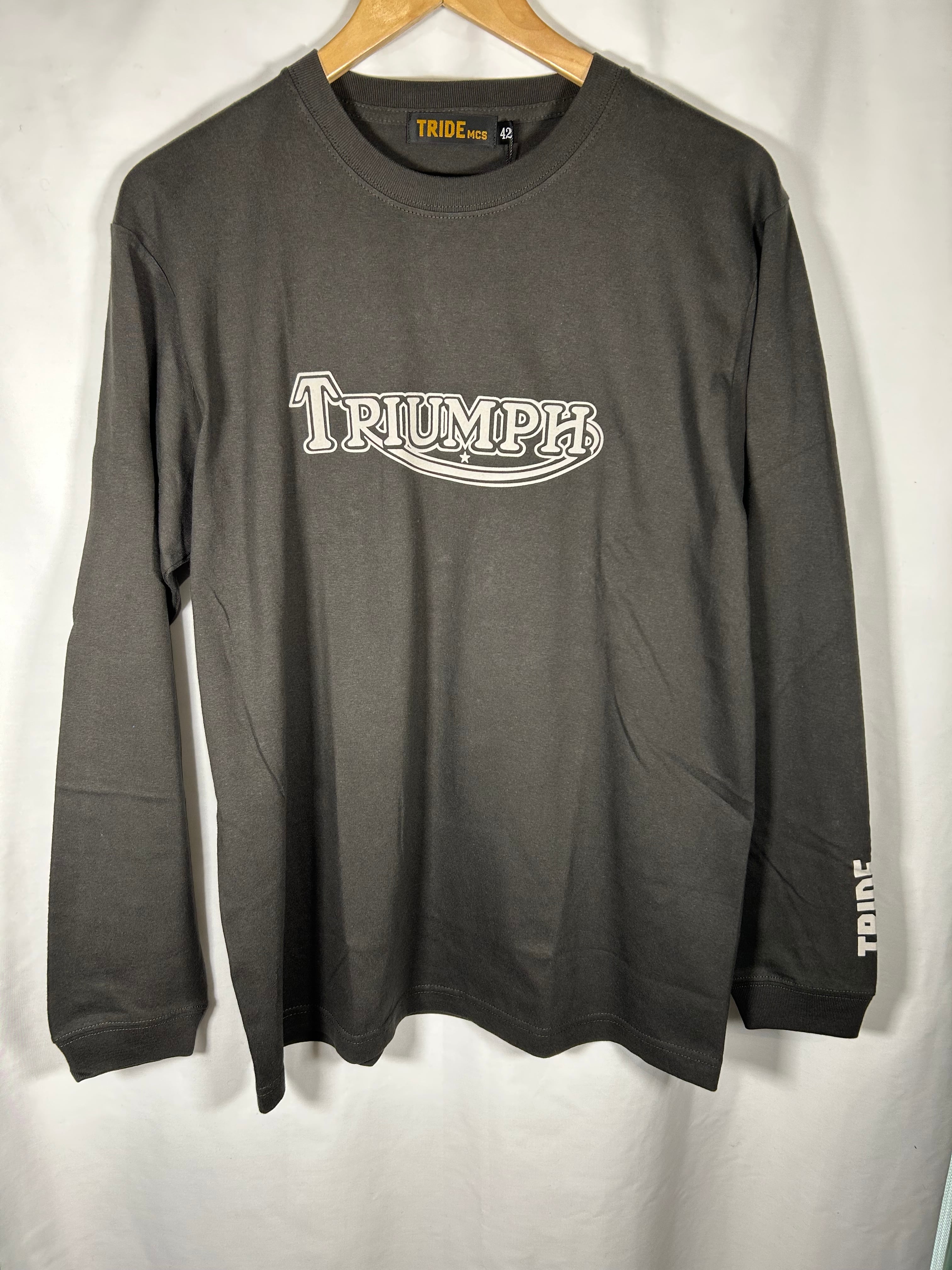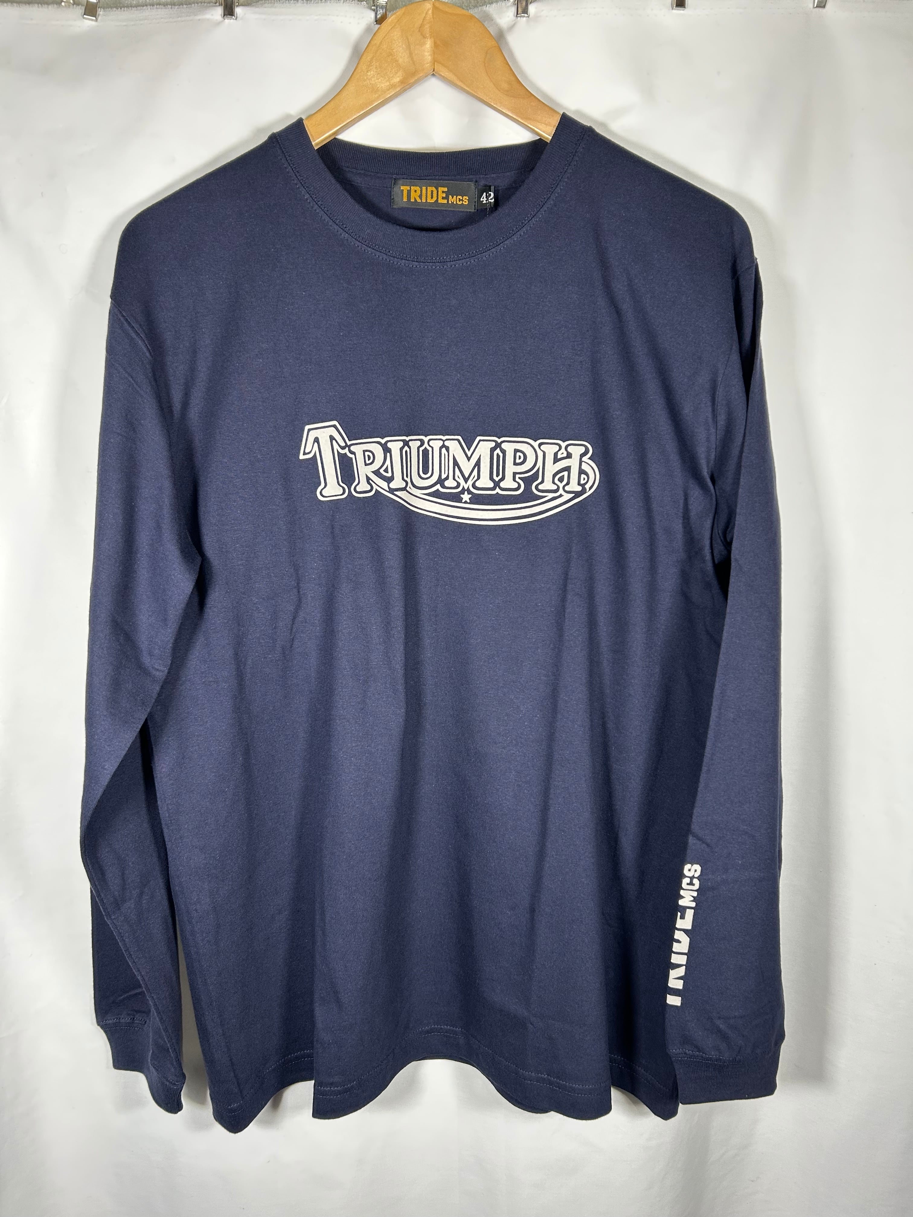 TRIDEトライドのオールドスタイルロゴのロンTです。袖にもさりげなくプリント施し信号待ちでも一際目立つ様にしました。5.6オンスのミディアムウエイトボディを使用しロングシーズに着用可能です。ホワイトxブループリント。ホワイトxレッドプリント、ネイビーとスミ黒の4色展開です。