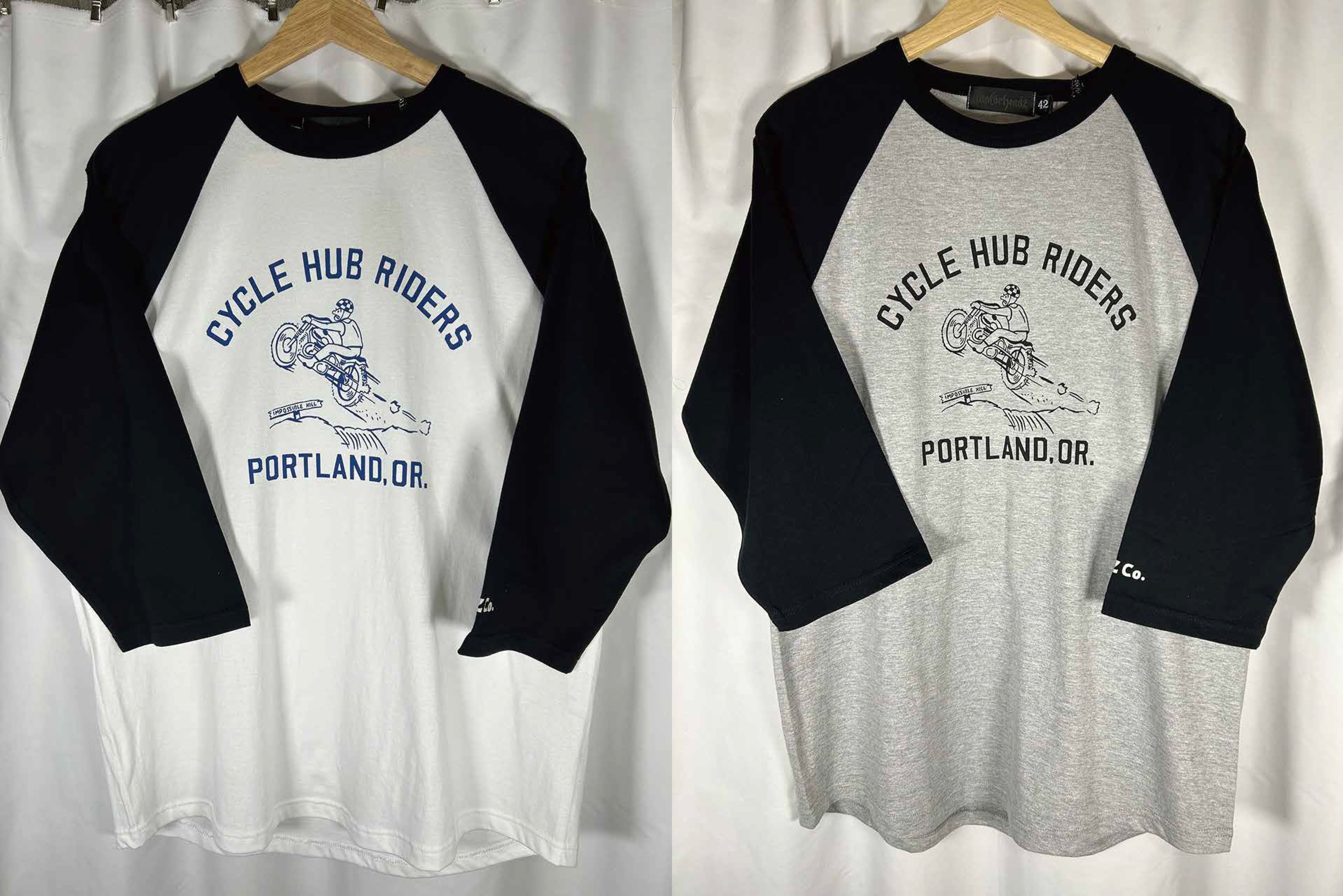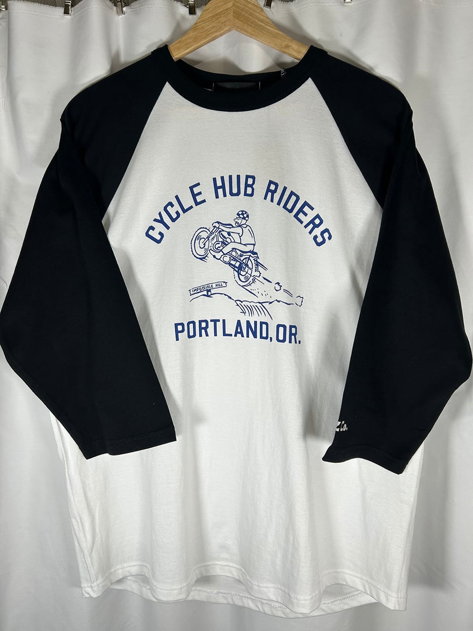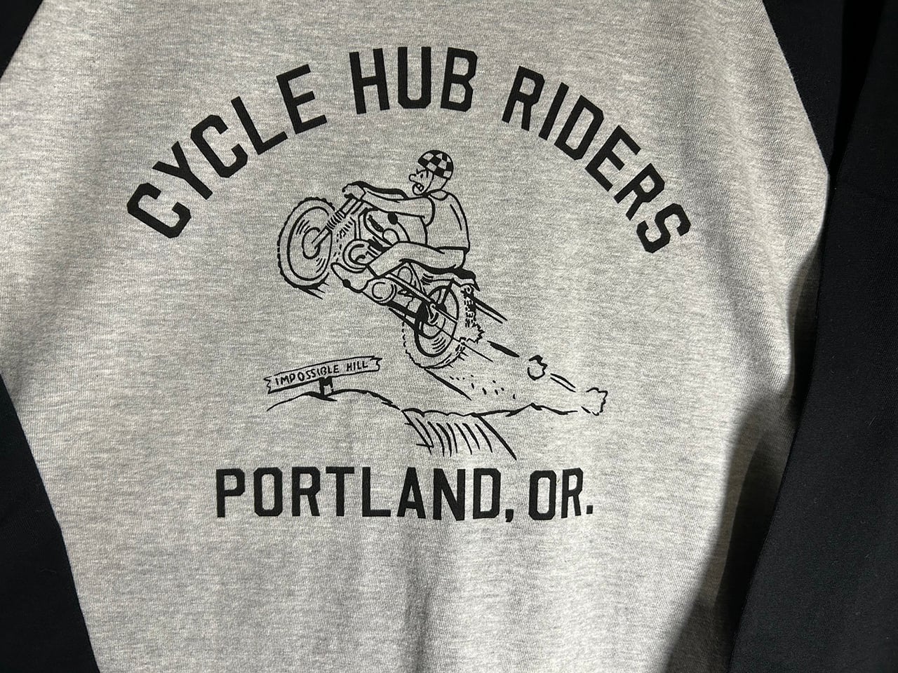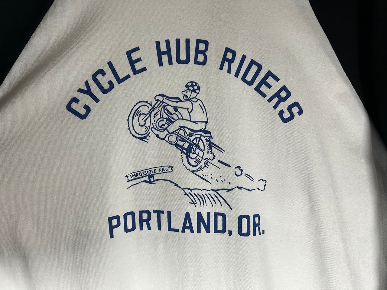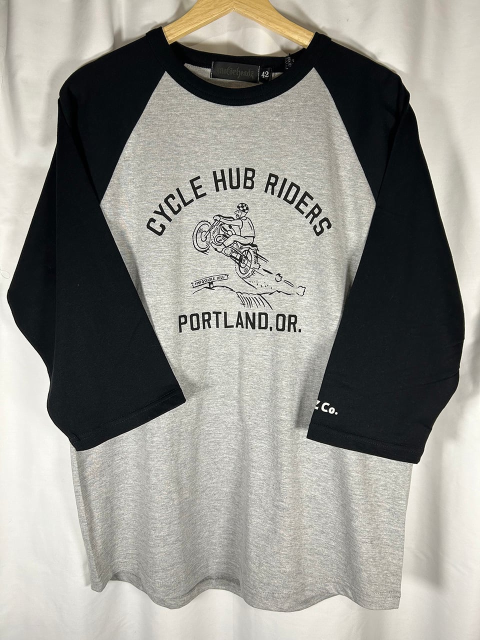 MOTORHEADZのオールドスタイルモトクロスラグラン3/4袖Tです。トライアンフのモトクロスCYCLE HUBライダーの絵柄、袖にもさりげなくプMHZ Co.のロゴをプリント。5.6オンスのミディアムウエイトボディを使用しロングシーズに着用可能です。ホワイトxブラック袖はネイビープリント。杢グレートxブラック袖はブラックプリントになります。