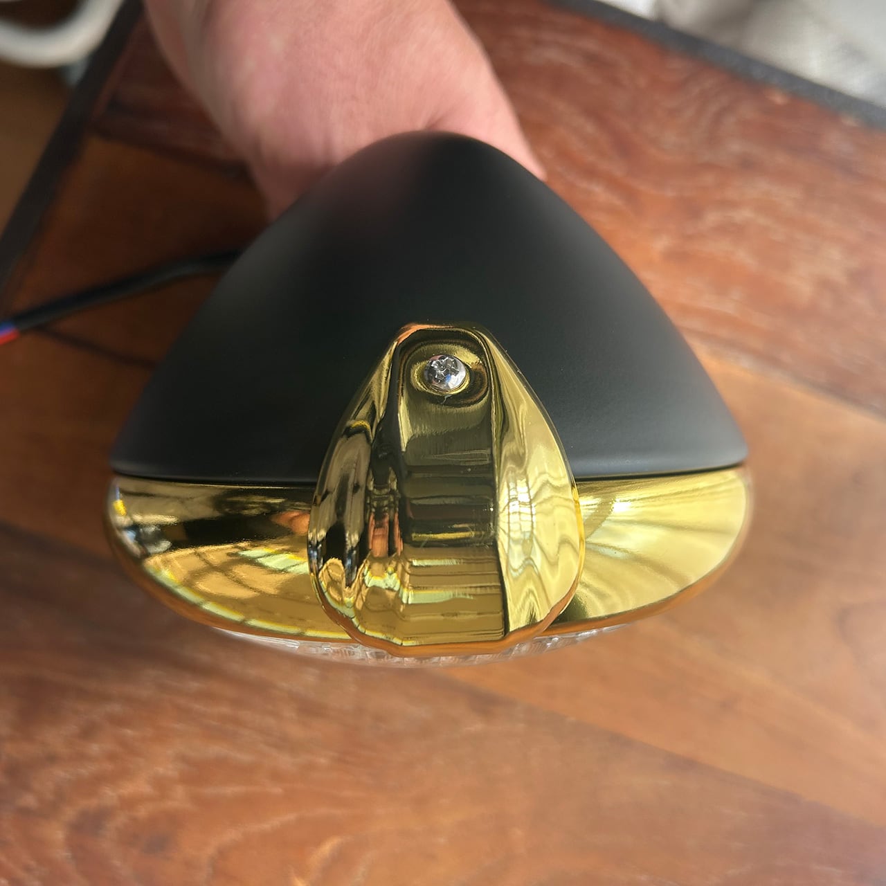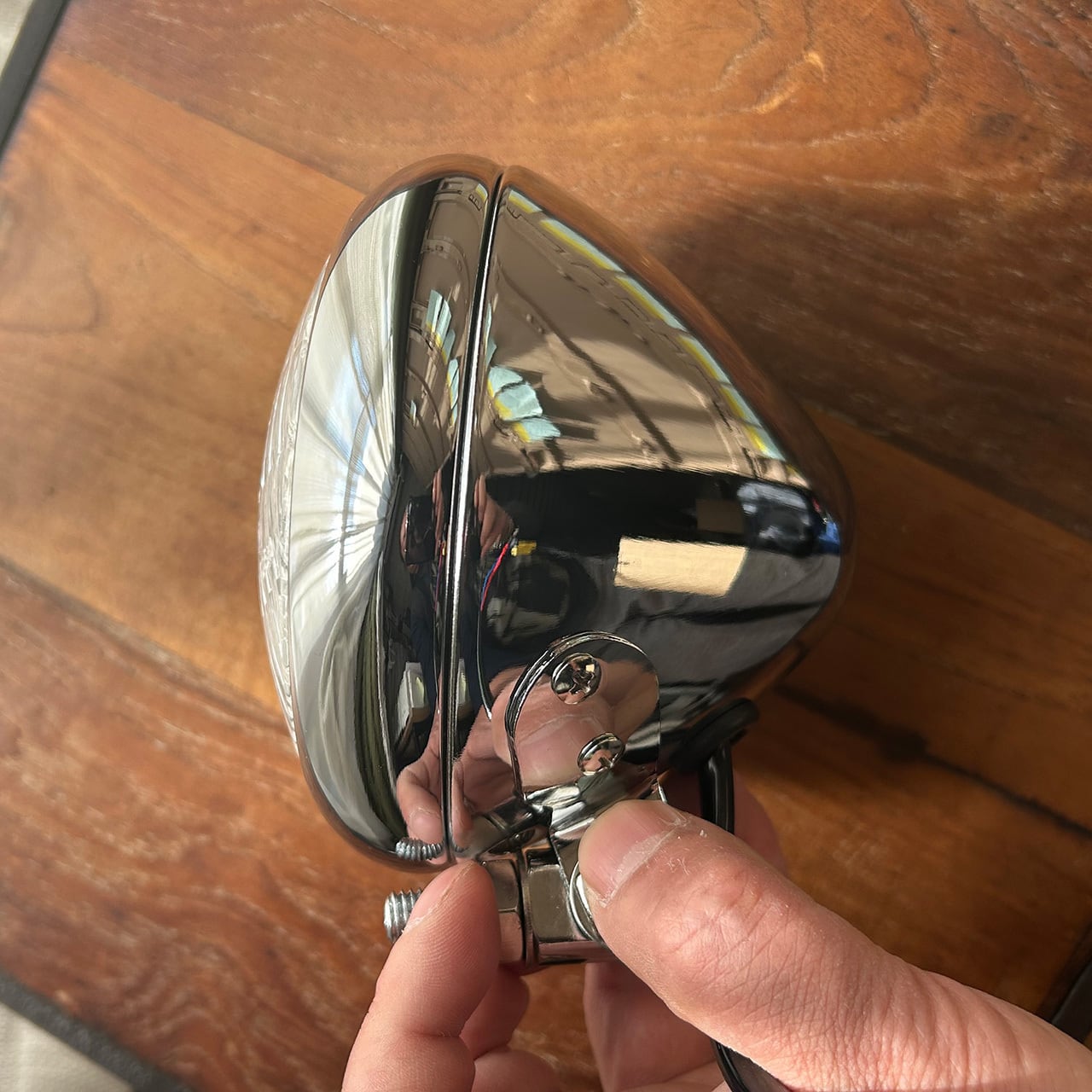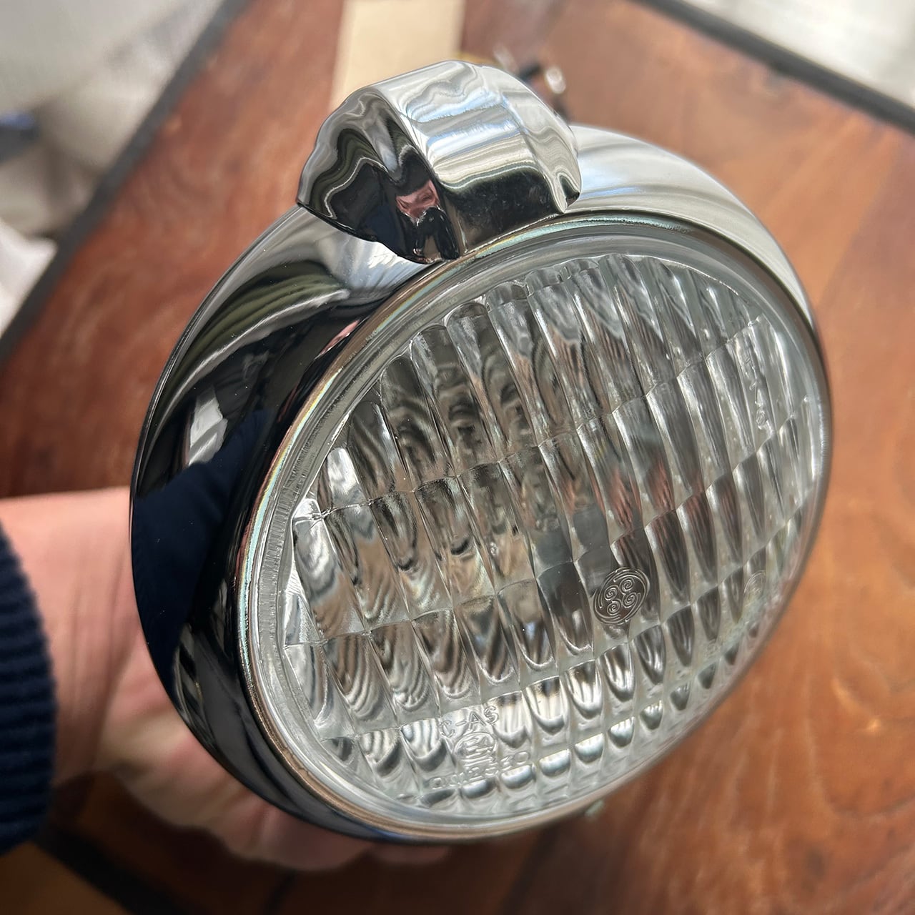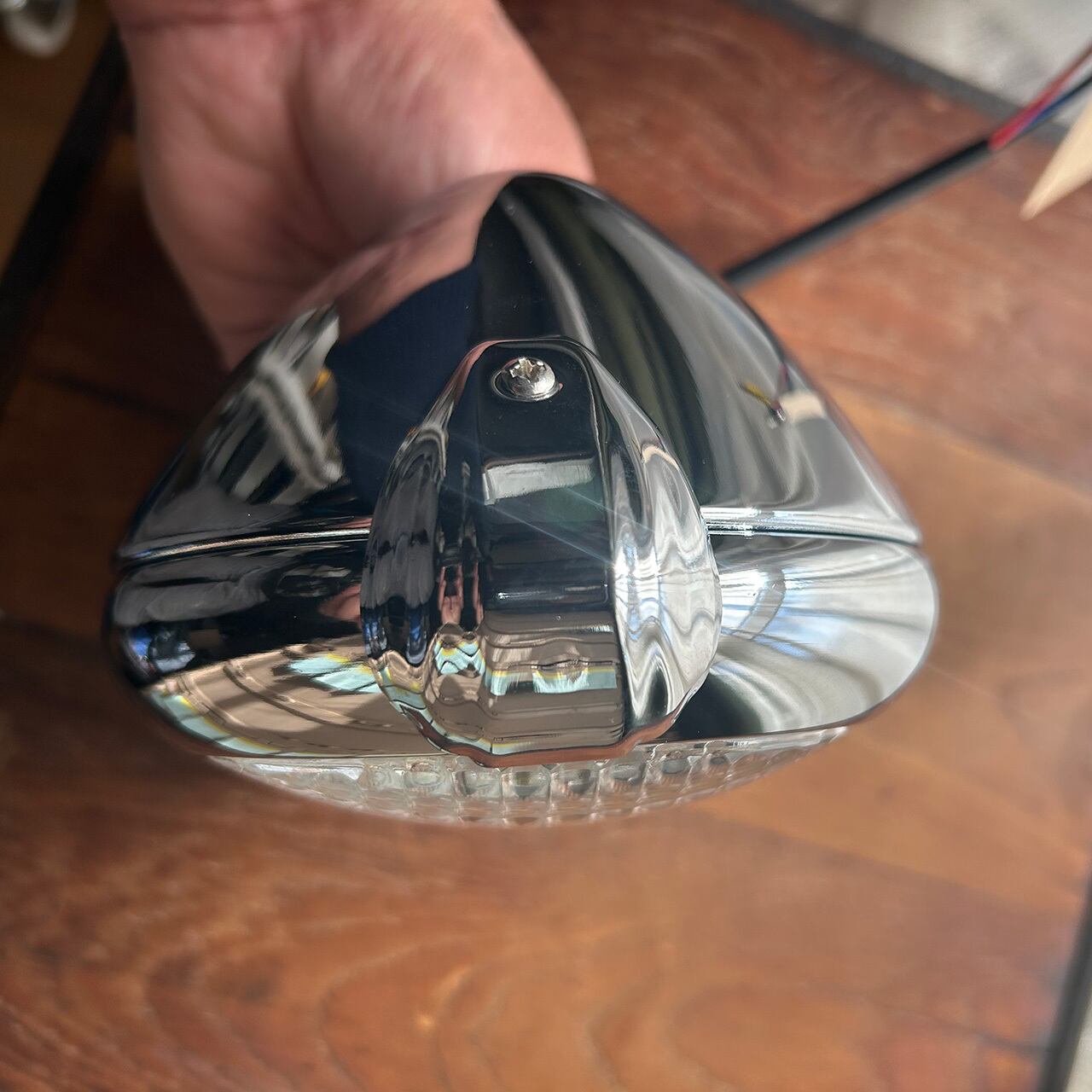 王道のヴィンテージ感がありスッキリしたカスタムに適したサイズ感です。こちらはボトムマウントになり、本物でもサイドマウントばかりなのでおすすめのです。インジケーターの色は本物と違いブルーとなります。ハイ、ローの12Vバルブ式です。