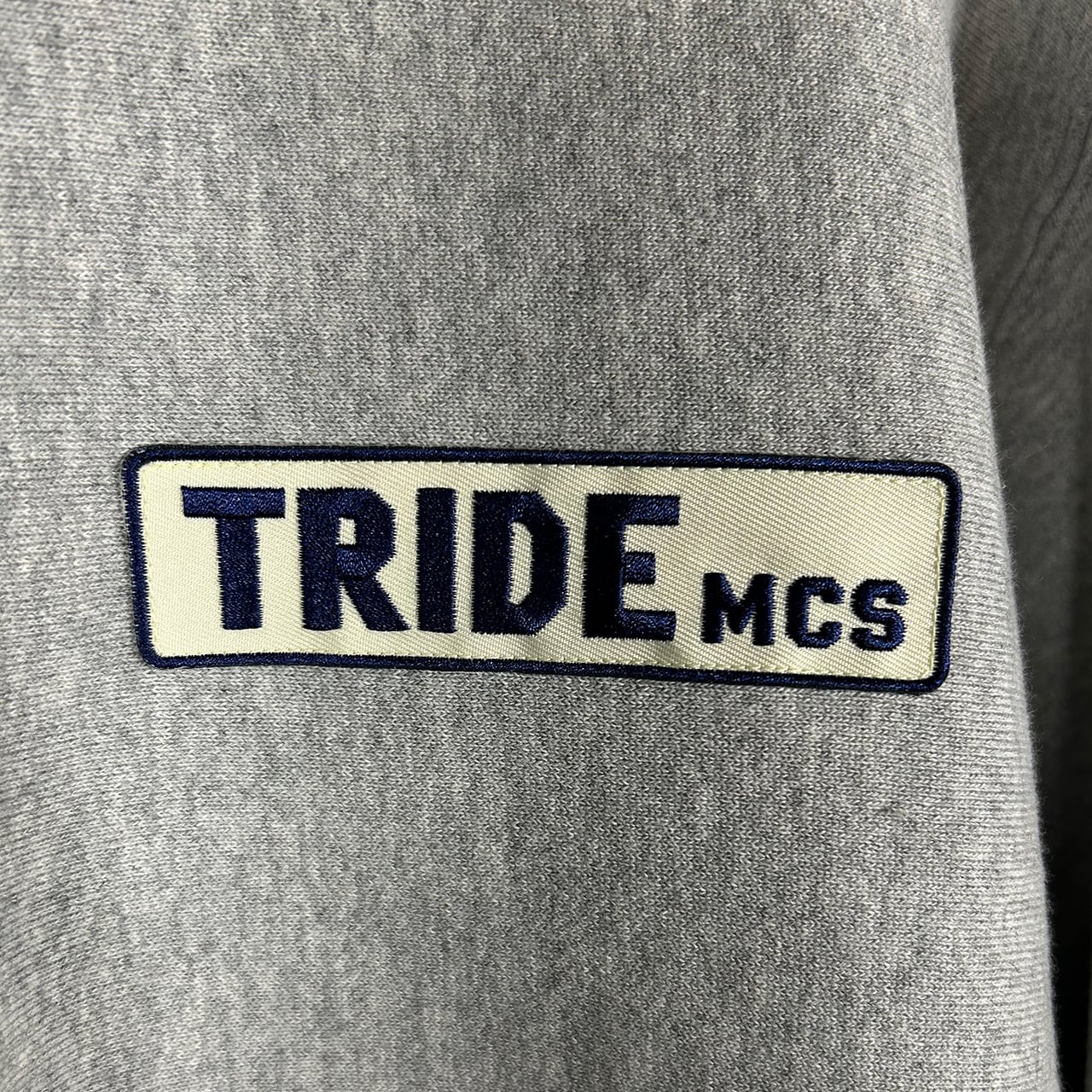 色はネイビーボディにオフホワイトプリント、杢グレーボディにネイビーのプリント。袖にワンポイントのロゴはプリント、左胸にはTRIDEのワッペンを配した高級感溢れる仕様になります。
