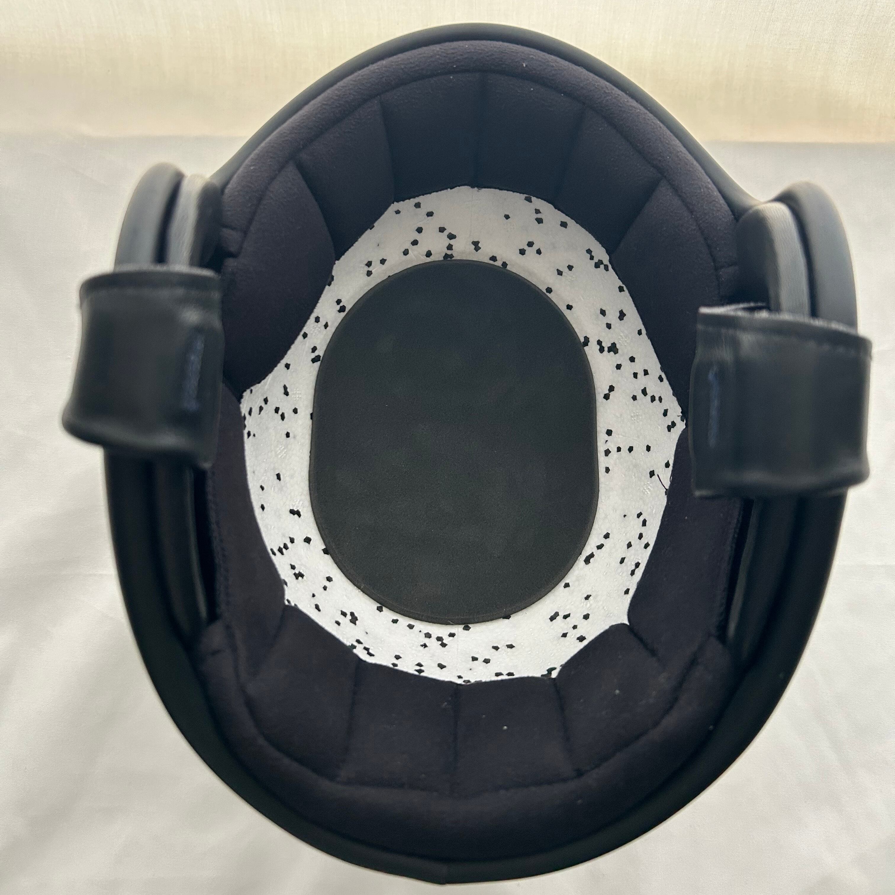 ヴィンテージのヘルメットや装飾用のヘルメットが横行している現在、少しでも安全性を高めるため開発。衝撃緩衝材を用い、簡単にヘルメットに着けることができるよう粘着テープ付き。